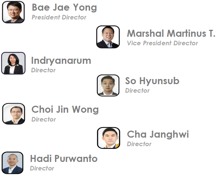 The following is the Board of Directors of PT Hyundai Inti Development according to the company's data contained in Deed No. 9, Notary Sulasmini, SH, M.Kn. dated April 23, 2025 and has been approved by the Minister of Law dated April 28, 2025 Number: AHU-AH.01.09.0209729.